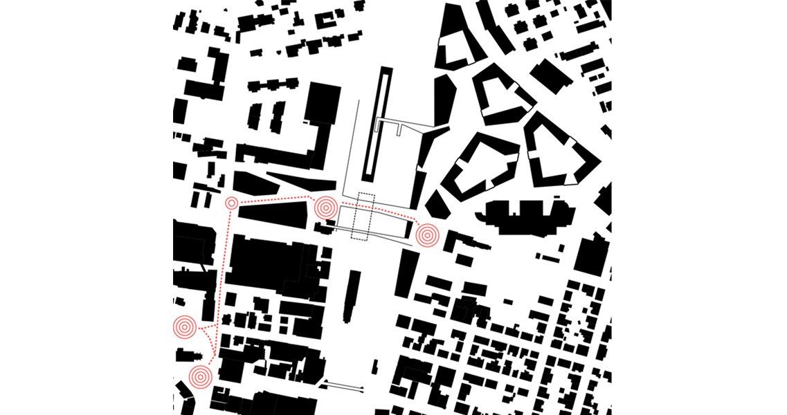Die bestehende unter Denkmalschutz gestellte Tankstelle wird in das Grünraumkonzept mit aufgenommen. Der ZOB in den Norden des Bahnhofgebäudes mit Anschluss an die Oberboihinger, verlegt. Auf dem Gelände des heutigen ZOB´s gelangen die Besucher und Bewohner über den westlichen Bahnhofsvorplatz entlang des freigelegten Saubachs zwischen zwei langgezogenen Gebäudevolumen mit öffentlichen Nutzung im Erdgeschoss in die heutige Altstadt.