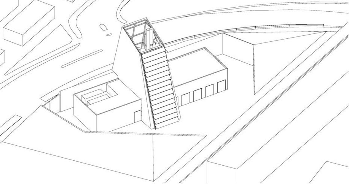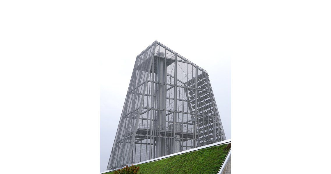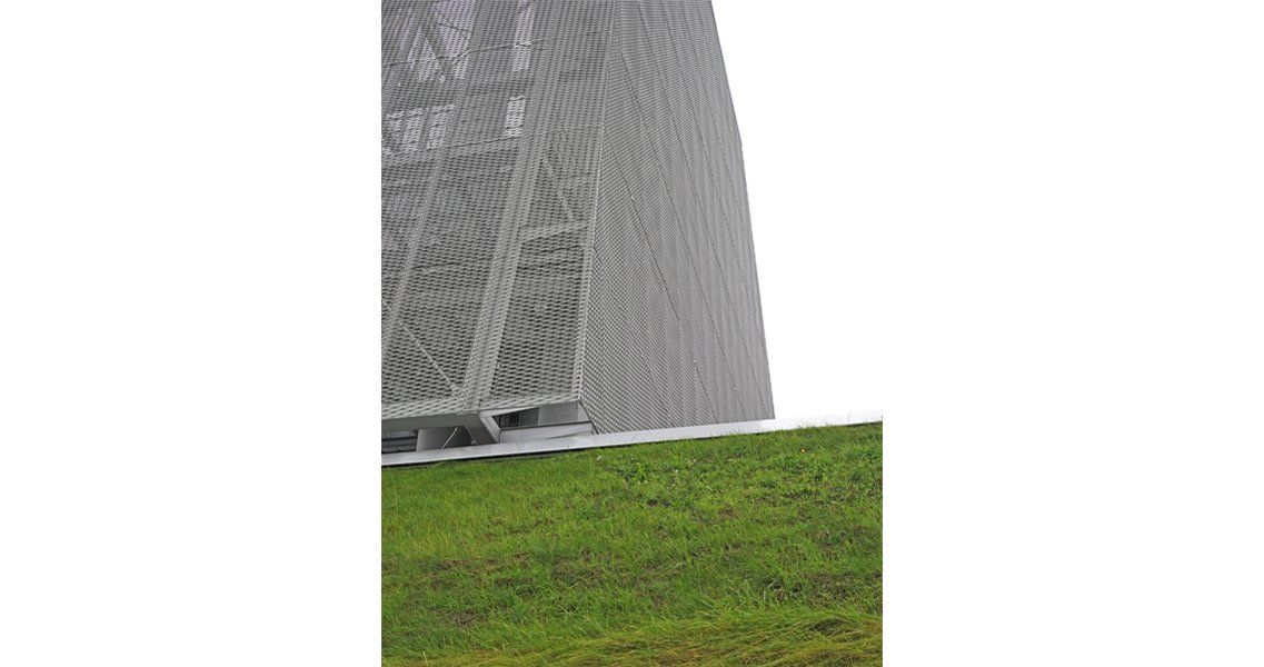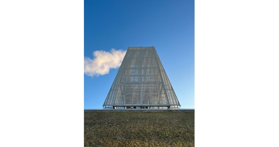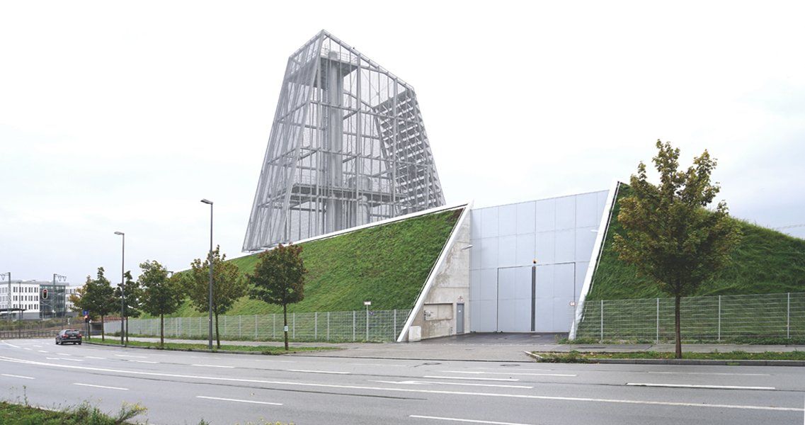 Ein steiler grüner Sockel bildet die Basis für die kristalline Ummantelung der Schornsteine und Speicher. Die metallene, aber durchscheinende Haut des Turmes überformt die dahinterliegende Technik und wird zu einer eigenständigen Skulptur. Auf der schrägen Südseite thematisieren großflächig verlegte, glatte Photovoltaikpaneele die ökologische Energieversorgung.