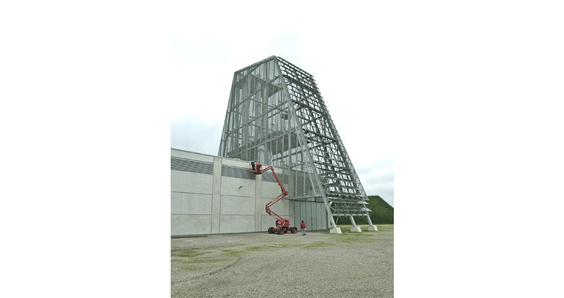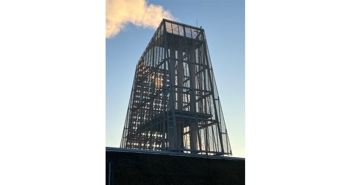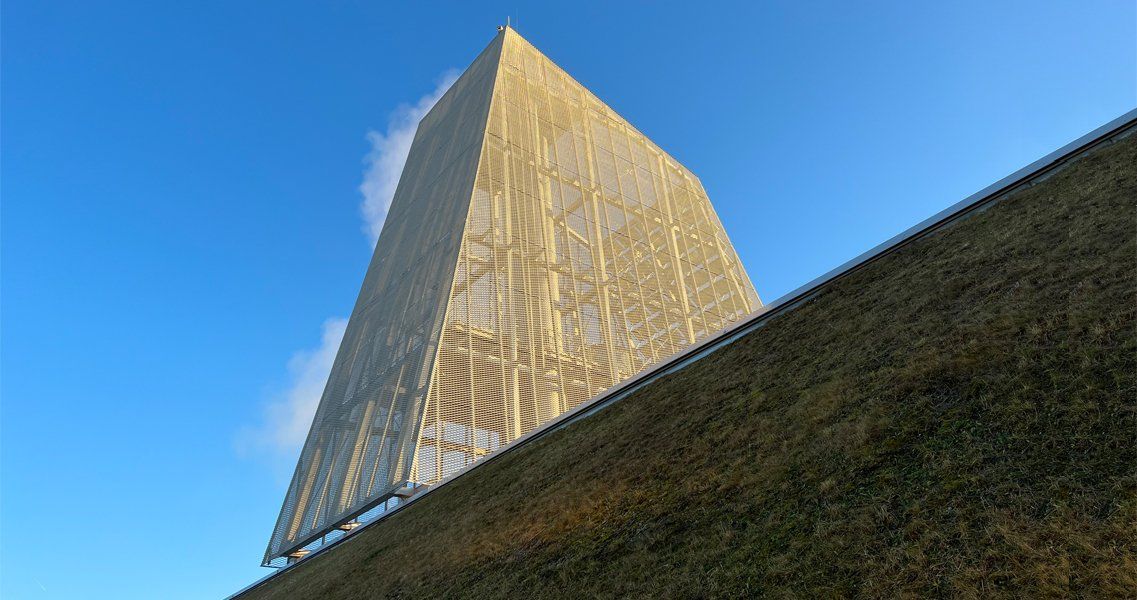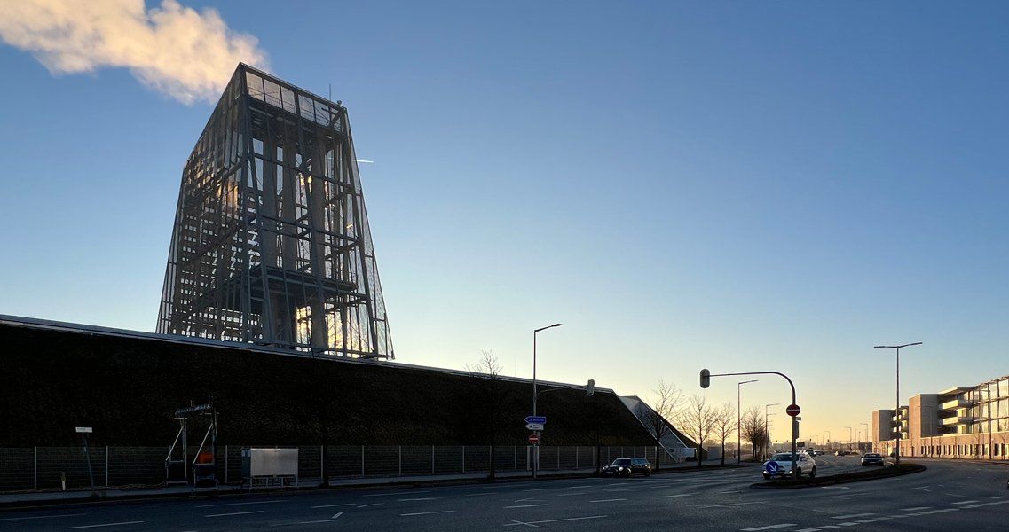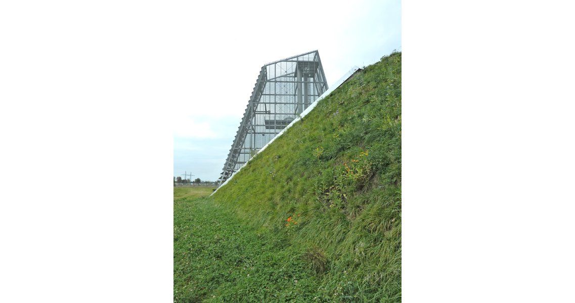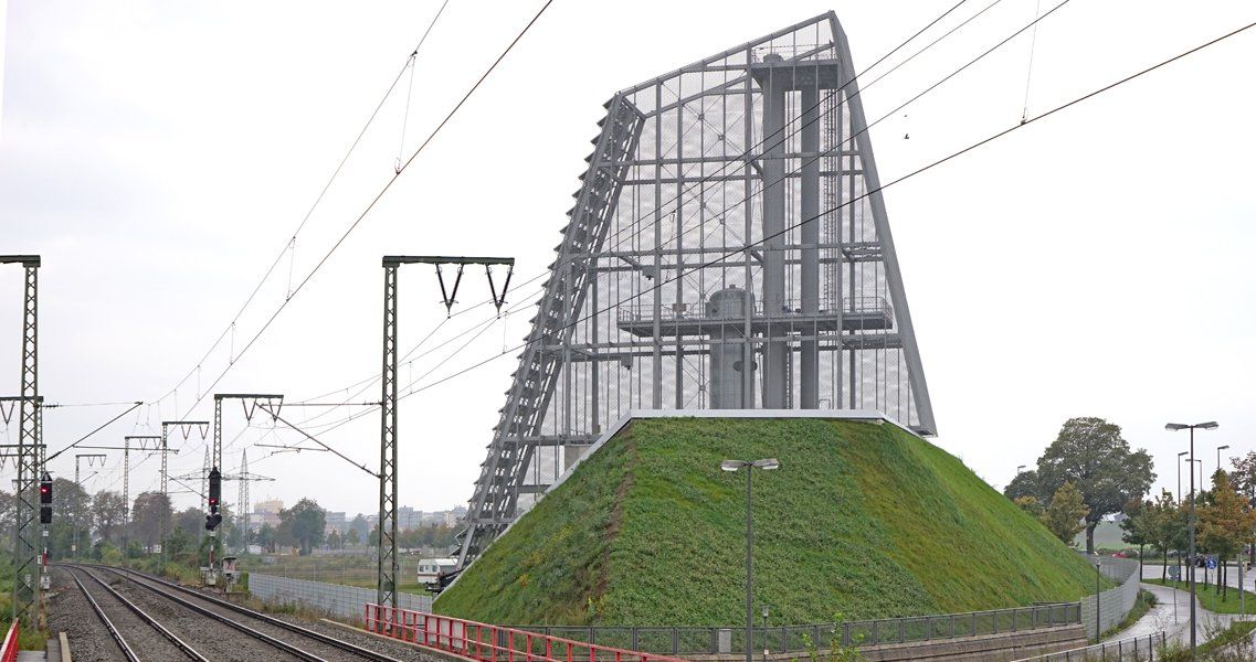 Ein steiler grüner Sockel bildet die Basis für die kristalline Ummantelung der Schornsteine und Speicher. Die metallene, aber durchscheinende Haut des Turmes überformt die dahinterliegende Technik und wird zu einer eigenständigen Skulptur. Auf der schrägen Südseite thematisieren großflächig verlegte, glatte Photovoltaikpaneele die ökologische Energieversorgung.