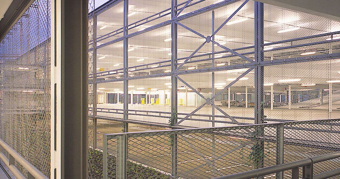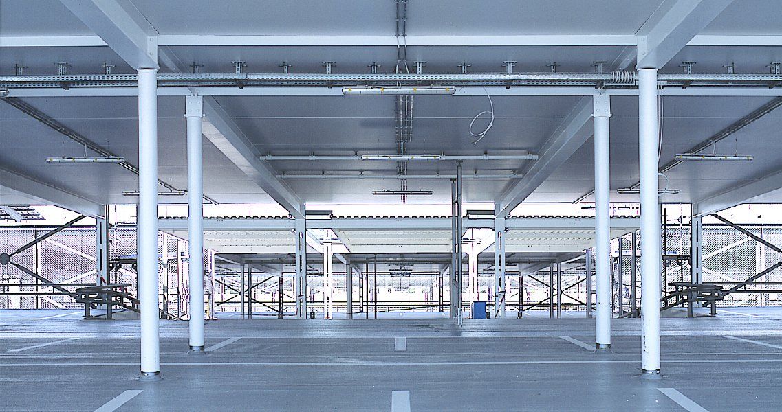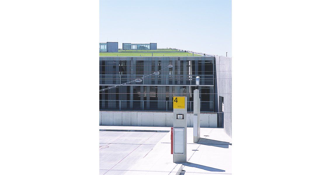 Das eigentliche Parkhaus ist als dreischiffige Stahl- / Beton-Verbundkonstruktion unter das Dach, zwischen die Wandscheiben gestellt. Großzügige begrünte Lichthöfe belichten und belüften es auf natürliche Weise.