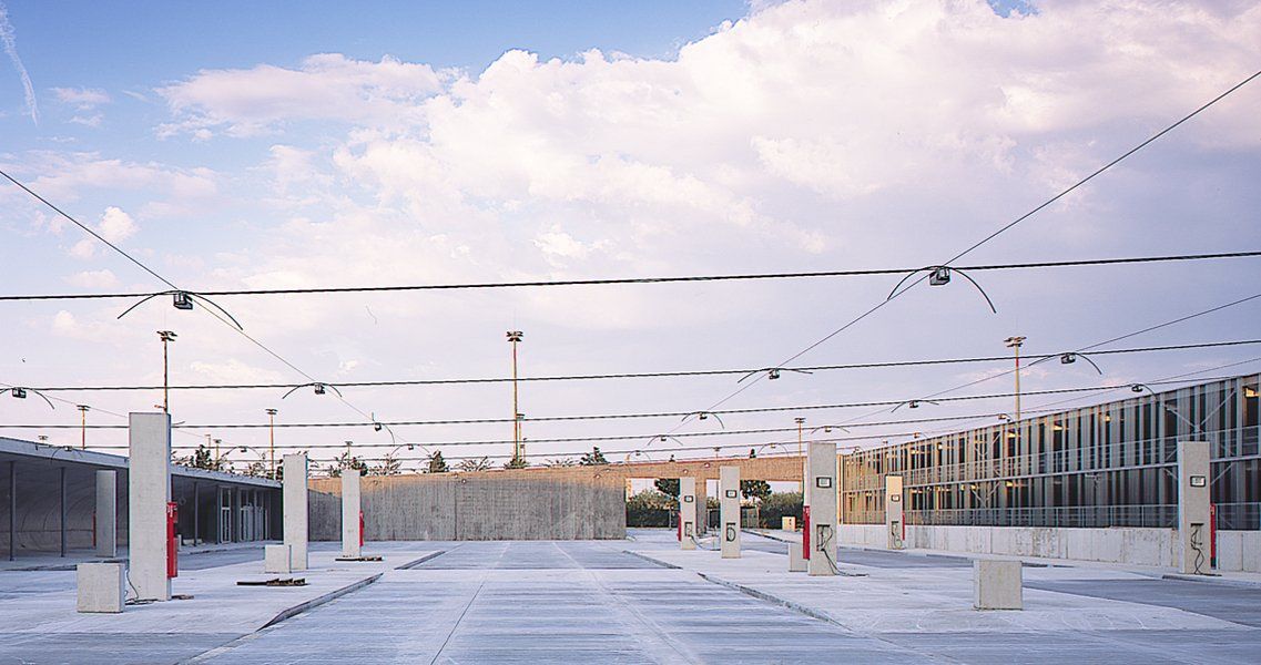 Der Busbahnhof im Norden der Anlage ist wie das Parkhaus durch die seitlichen Wände den Blicken der Passanten von außen entzogen. Unter dem ersten, niedrigsten Rasendach sind Warte- und Serviceeinrichtungen für die Reisenden untergebracht.