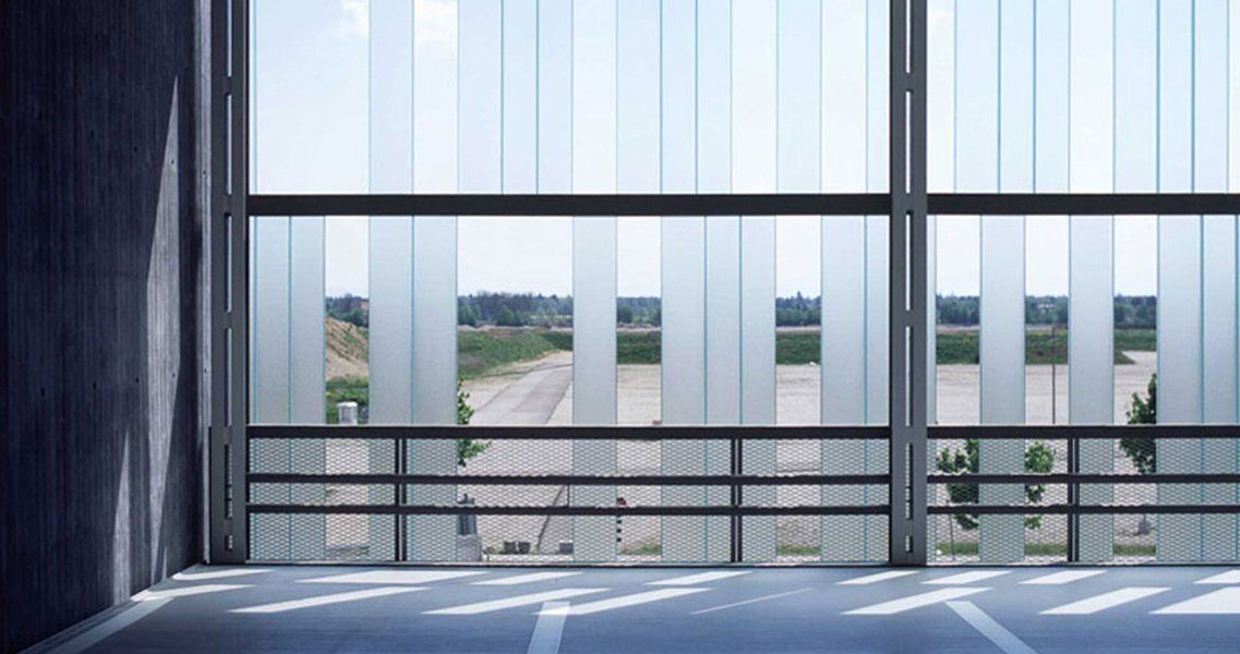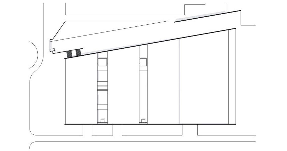 Es wird an den Längsseiten von zwei dunklen Wänden aus Sichtbeton eingefasst, die als Keile nach Süden aufsteigen und erst an der Willy-Brandt-Allee als Raumwand wirksam werden. Dort zeigt eine gläserne Fassade den Zweck des Gebäudes.